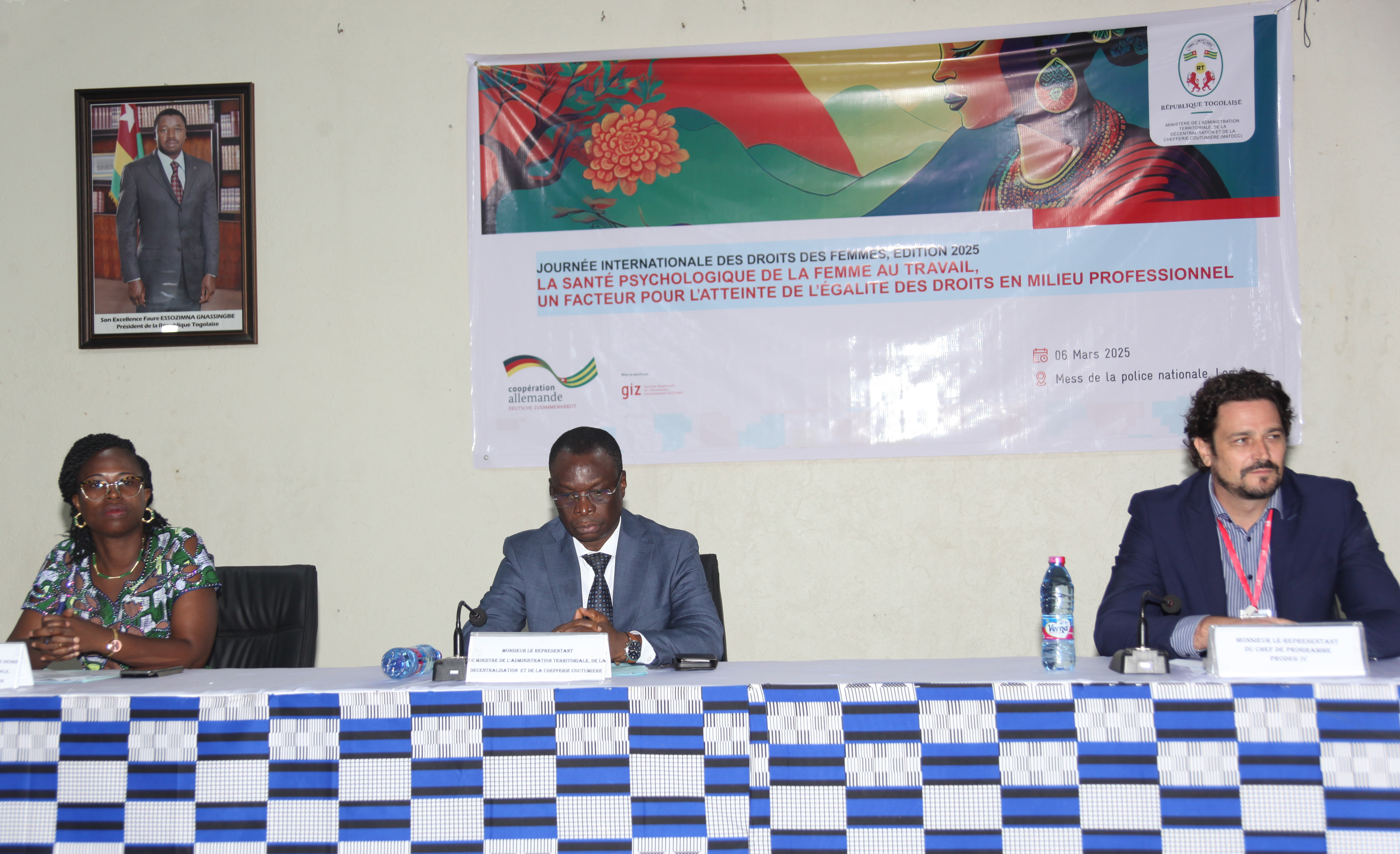 Le représentant du chef programme de la GIZ au Togo, monsieur François Nussbicker, expert en équité-genre et conseiller auprès du MATDCC, a salué et félicité le ministère pour le choix et la pertinence de ce thème, révélateur de combien il est très important de porter une grande attention à la problématique des difficultés défiant la santé psychologique de la femme au travail pour un plein épanouissement. Il a réaffirmé l’engagement de son institution GIZ au Togo à soutenir les efforts du ministère visant à promouvoir l’efficacité des femmes aux postes de responsabilité dans tous les secteurs de la société. ‘’Nous sommes persuadés qu’ensemble, en travaillant main dans la main, nous pouvons créer un avenir où chaque individu a la possibilité de réaliser son plein potentiel’’, a conclu monsieur François Nussbicker.
