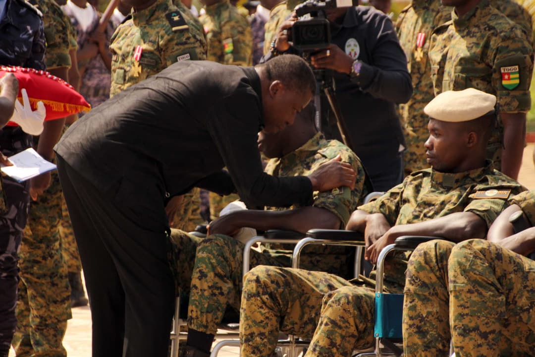 Moment central de la cérémonie, le Président du Conseil a procédé à la décoration, à titre posthume, des militaires tombés en 2025, les élevant à la dignité de Chevaliers de l’Ordre du Mono. Après la lecture des citations officielles retraçant leurs faits d’armes, il a également distingué les soldats blessés ainsi que d’autres éléments des Forces Armées Togolaises pour leur bravoure et leur contribution remarquable à la préservation de la sécurité et de la stabilité nationales.