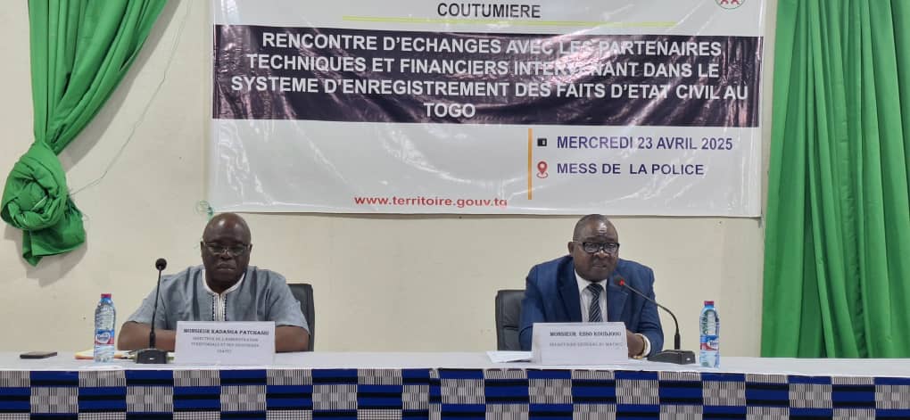 Il s’agissait d’une rencontre d’échanges et de concertation organisée sur fonds propres le mercredi 23 avril 2025 à la salle de conférence au mess des officiers de la police nationale à Lomé, par le ministère de l’administration territoriale, de la décentralisation et de la chefferie coutumière (MATDCC). Elle a réuni les partenaires techniques et financiers (PTF) intervenants du système d’enregistrement des faits d’état civil pour définir et mettre en place un cadre permanent entre acteurs nationaux et PTF, visant à assurer une meilleure coordination des actions d’intervention de terrain en lien avec l’enregistrement des faits d’état civil sur l’ensemble du territoire national. Aussi, ce cadre d’échanges et de concertation suscité, entend-il informer régulièrement les PTF sur les actions prioritaires du gouvernement à travers le ministère MATDCC en matière d’état civil, mobiliser ceux-ci dans la mise en œuvre de la feuille de route sur la relecture de la loi relative à l’organisation de l’état civil